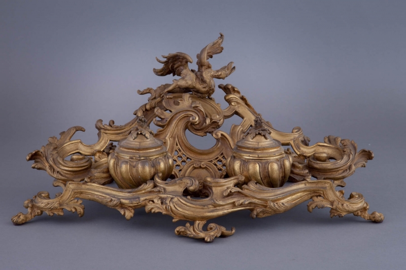 Wonderful late 19th century French Dore bronze Louis XV style double inkwell with fitted glass liners, of elaborate scrolling form, with a centered griffin figure and paw feet.