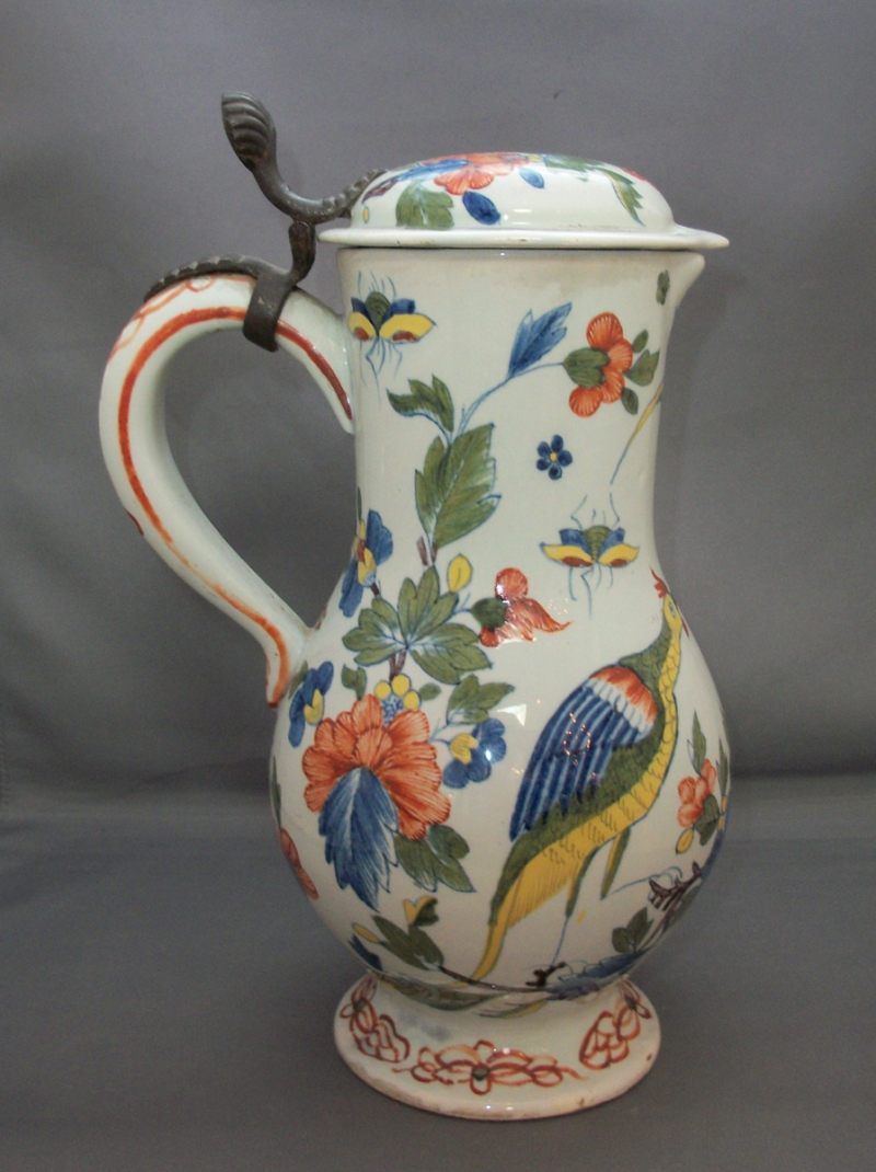 Beautiful first half nineteenth century French faience baluster form jug, cover with hinged pewter mount, handpainted with florals, birds and butterflies. Blue underglaze marks HV. and back to back 'C'.