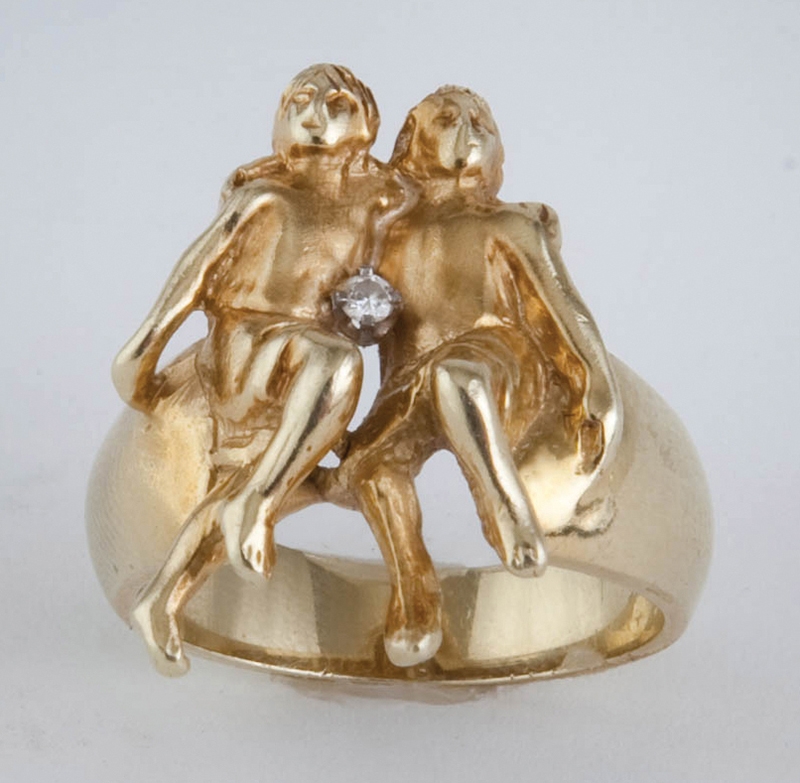 Zodiac ring depicting the Gemini twins with centered diamond. Size 8.Excellent condition.