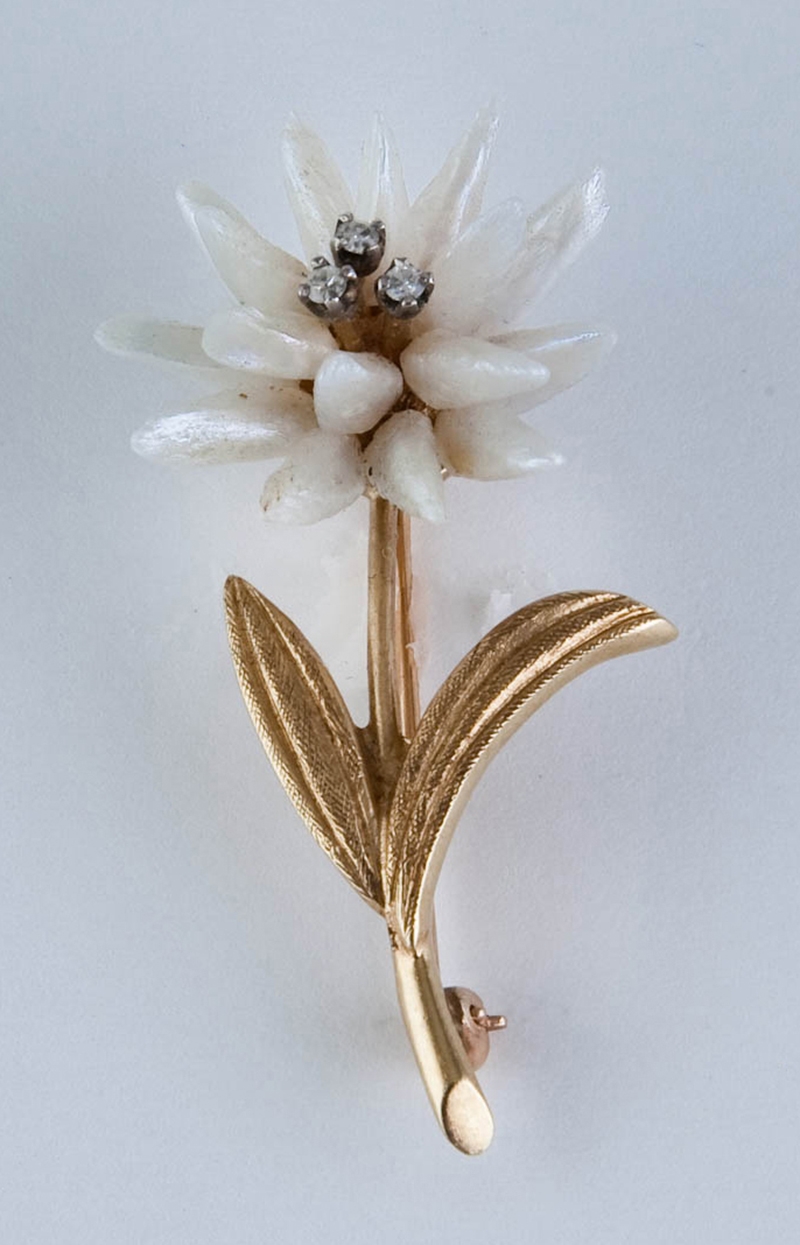 Yellow gold flower leaf motif, with sixteen Keshi pearl petals and three centered cut diamonds. Excellent condition. Height 1 3/4in; Width 3/4in