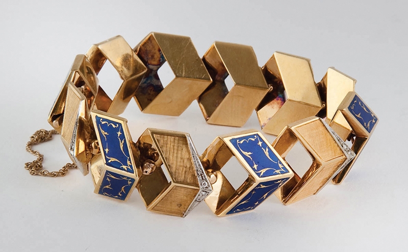 Geometric design, with lapis color enameling alternating with diamonds and Florentine gold. Very good condition. Length 7in; Weight 71grams