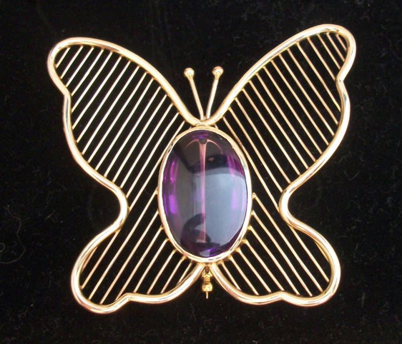 Fine custom made, large one of a kind, 14 karat gold pin / pendant with cabochon amethyst beautifully designed in the form of a large butterfly by the renown craftsman Allan Adler. Cabochon amethyst flat on top, rounded underneath.