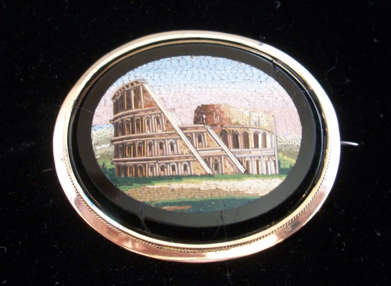 Beautiful and large late 19th / early 20th century Italian micro mosaic brooch, depicting the Colisseum in Rome, 18k gold grand tour piece.