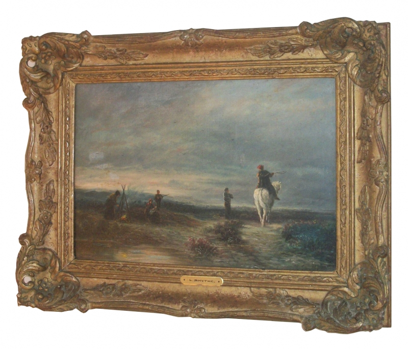 Wonderful 19th century oil on canvas painting of a countryside scene with a family, horse and campfire, by L. Smythe.