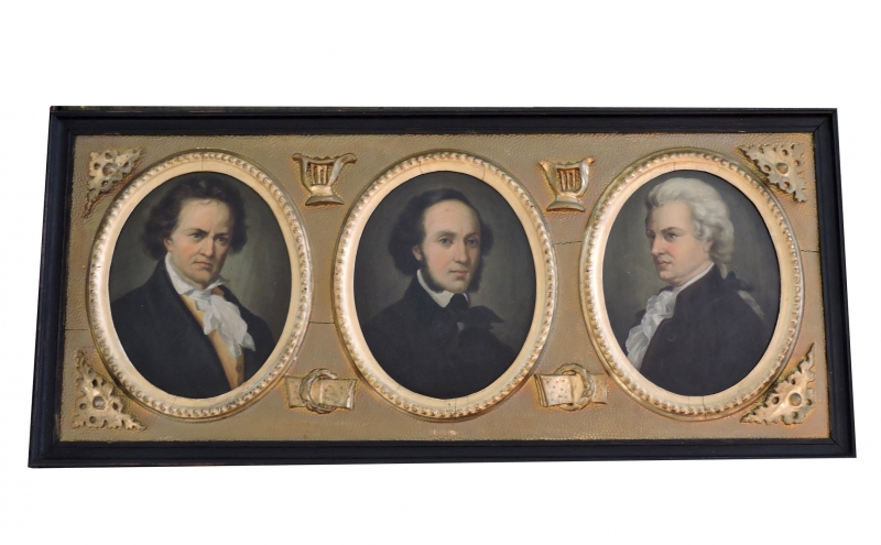 Late 19th / early 20th century painted oval portraits on terracotta plaques, depicting Beethoven, Mendelsohn and Mozart, all mounted in a Victorian carved gilt wood rectangular frame.