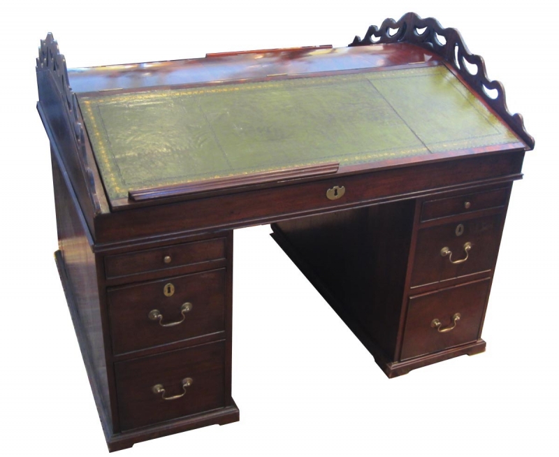 Handsome and unusual early 19th century, English Regency period circa 1815 mahogany Architects Partners slant-top desk with two green tooled leather writing surfaces that lift to reveal cubby holes and compartments below. Six drawers on each side, four deep and two narrow. The sides of the desk with raised pierced mahogany gallery. Original pulls, locksand escutcheons (one lock missing).