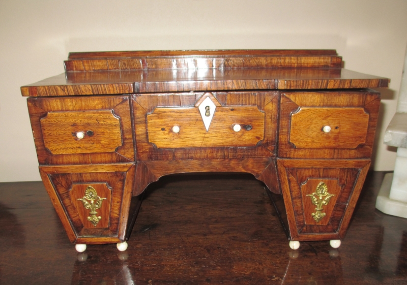 A charming inlaid rosewood tea caddy in the form of an inverted breakfront sideboard with hinged rectangular top opening to a fitted interior with cylindical mixing bave flanked by two compartments raised on tapering pedestals with tole anthemim mounts, all on bone, ball feet.